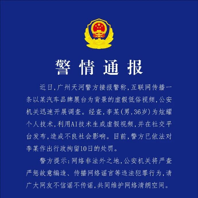 通 报 用AI生成“车展虚假低俗视频”,李某被行拘10日