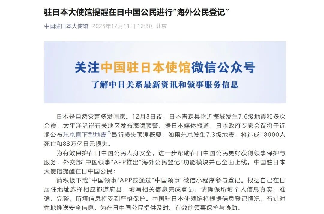驻日本大使馆提醒在日中国公民进行“海外公民登记”日本是自然灾害多发国家。12月8日夜,日本青森县附近海域发生7.6级地震和多次余震,太平洋沿岸有关地区发布海啸预警。据日本媒体报道,日本政府专家会议将于近期公布东京直下型地震最新损失预测概要,如果东京发生7.3级地震,将造成18000人死亡和83万亿日元损失。