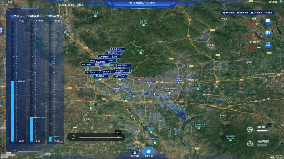 省级矩阵平台纳入全省水库基于1985国家高程基准和2000国家大地坐标系的管理与保护范围划界、上下游水系、控制流域边界、溃坝淹没范围、避险安置等专题图,精准掌握重要水库群与上下游水系、村镇、重要基础设施的空间布局和关联关系,率先在大汶河、沂沭河等防洪重点流域实现流域洪水过程动态预演,推演形成水库群联合调度方案。山丘区水库矩阵平台实现不同量级洪水动态演进过程,精确模拟淹没范围、到达时间、淹没人口,自动提取涉及相关人员信息,并根据决策者需要发送转移信号提醒,为水库调度预案迭代优化、人员转移安置、应急抢险提供关键信息支撑。平原水库矩阵平台实现引蓄供一体化预演,确保区域用水安全。