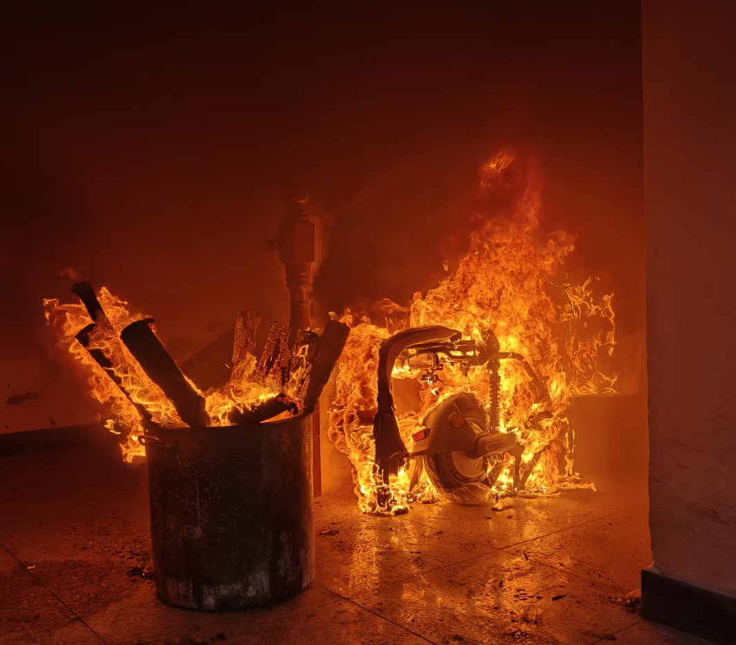 体验现场,正在燃烧的电动自行车。杭州消防供图
