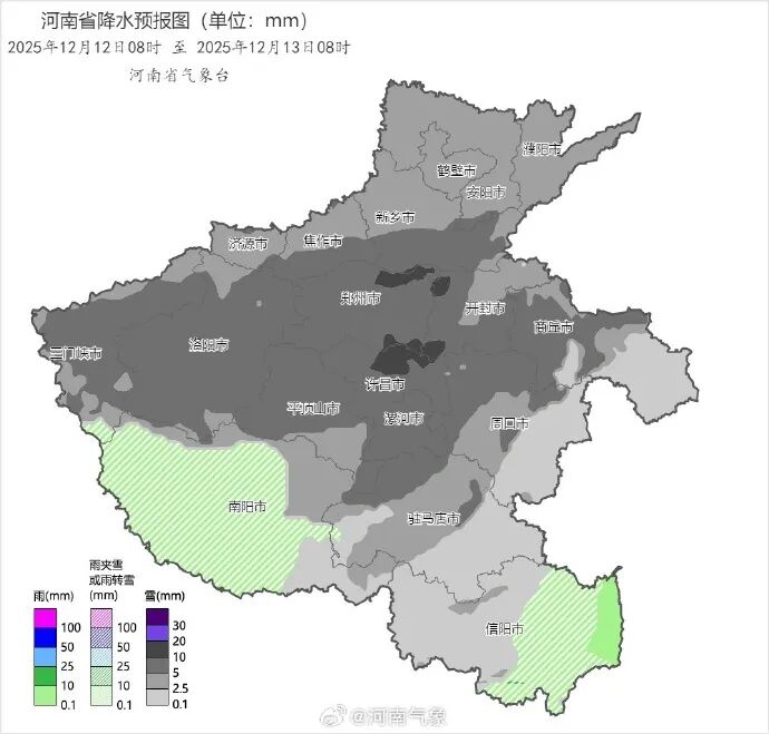 河南省气象台2025年12月11日12时00分发布暴雪蓝色预警:预计12日08时到13日08时,安阳西部和东南部、濮阳、新乡、焦作、济源、三门峡、洛阳、郑州、开封、商丘中西部、平顶山、许昌、漯河、周口中西部、南阳北部和东部、驻马店中西部、信阳西部部分县(市、区)将出现5毫米以上降雪,其中三门峡北部、郑州东南部、平顶山东部和南部、许昌西部和中部、周口中部、驻马店北部局部将出现10毫米以上降雪,请注意防范。上述地区的相邻县(市、区)也需关注。