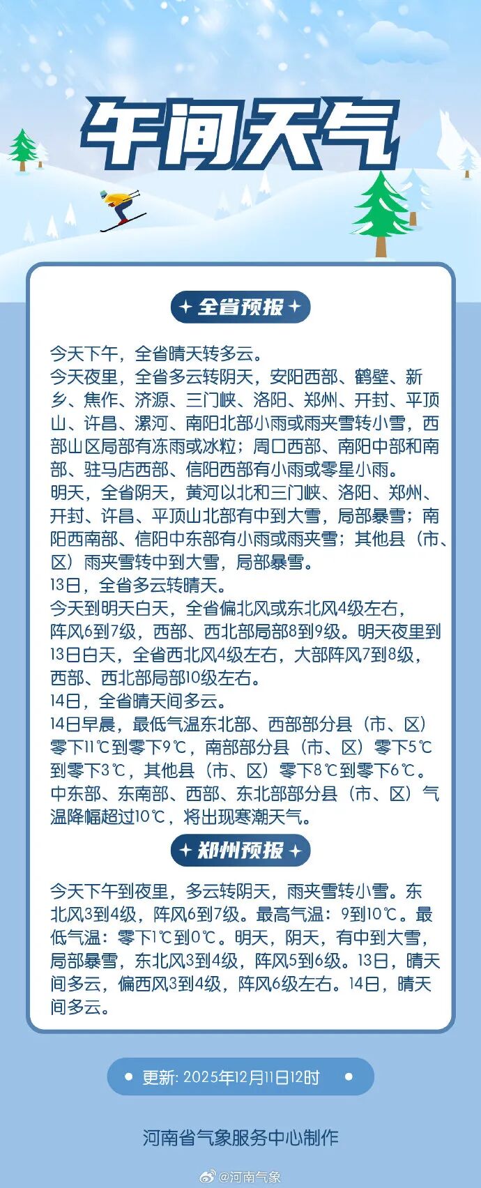 河南省气象台2025年12月11日12时00分发布寒潮蓝色预警:预计14日凌晨较12日凌晨,郑州南部、开封南部、商丘中西部、许昌东部、漯河东部、周口、驻马店、信阳、濮阳、焦作西南部、三门峡、洛阳西南部、南阳西北部和东南部部分县(市、区)最低气温下降10到12℃,预计12日凌晨,最低气温西部山区零下3℃到零下1℃,东南部4到6℃,其他县(市、区)0℃左右;14日凌晨,最低气温西部、东北部零下11℃到零下9℃,南部零下5℃到零下3℃,其他县(市、区)零下8℃到零下6℃。12日白天,全省偏北风或东北风4级左右,阵风6到7级,西部、西北部局部8到9级。12日夜里到13日白天,全省西北风4级左右,大部阵风7到8级,西部、西北部局部10级左右。请注意防范。上述地区的相邻县(市、区)也需关注。