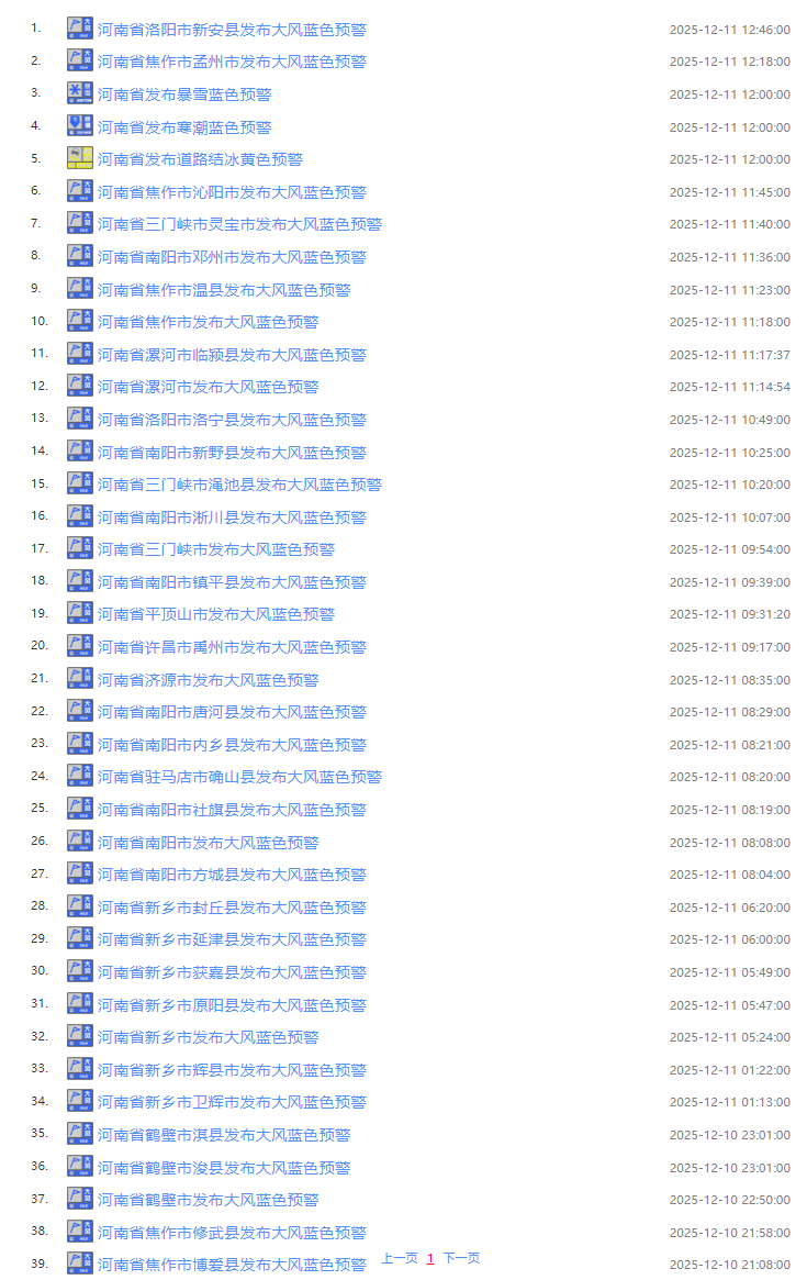 据@河南气象 最新消息,截至12月11日12:57,目前生效中的预警共有39个: