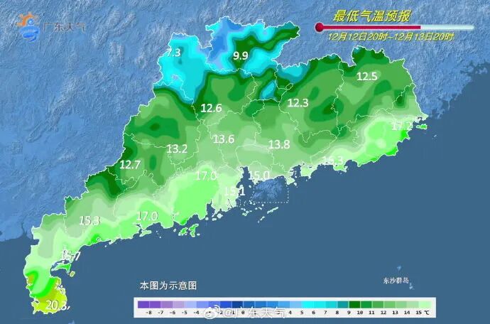 预计,13-14日受中等偏强冷空气影响,我省将有一次小到中雨局部大雨和4~8℃降温的天气过程,并伴有5~7级阵风,最低气温将出现在15日早晨前后:粤北市县3~7℃,部分市县有5℃以下的低温天气,高海拔山区0℃左右,局部有霜(冰)冻,南部市县13~15℃,其余市县8~12℃;15日白天气温逐步回升。