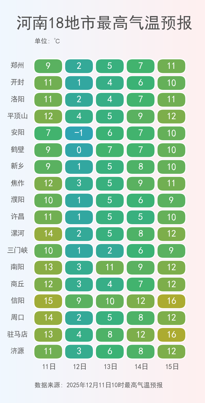好在13日起,白天气温将逐渐回升,15日全省大部最高气温多在10度左右,信阳、驻马店等地甚至升至15-17度。然而早晚气温却是持续下滑,14日早晨东北部、西部部分地区最低气温低至零下11度到零下9度,其余大部多在零下8度到零下6度,南部零下5度到零下3度。中东部、东南部、西部、东北部气温降幅超10度,将出现寒潮天气!