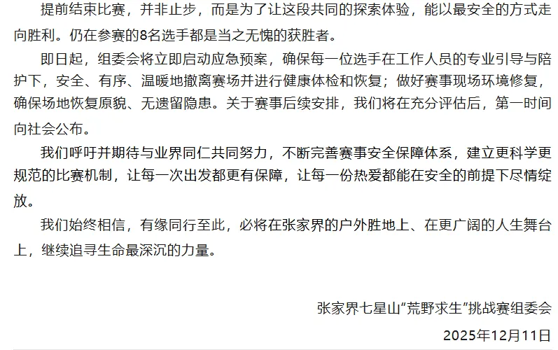 本赛事以“野外生存时间长短”为核心胜负标准,8名决赛选手已经参加较长时间的竞赛活动,在极端气候条件下,极易导致选手体力过度透支、判断力下降,甚至对身体造成伤害。经组委会慎重会商,决定提前结束第二季张家界七星山“荒野求生”挑战赛。