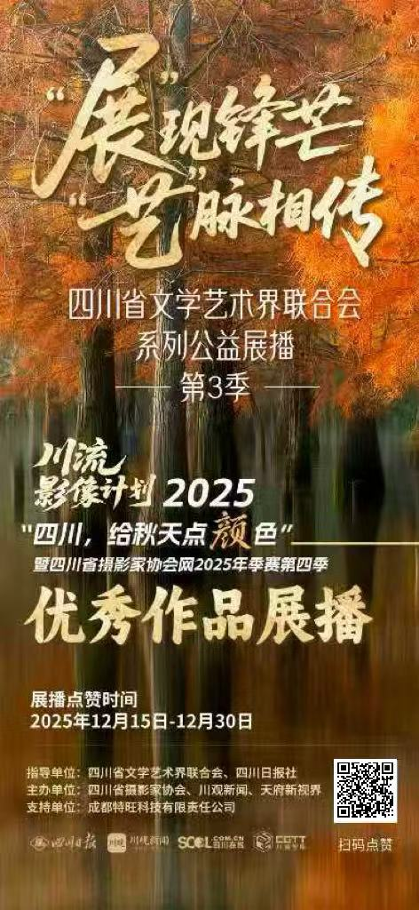 由四川省文学艺术界联合会与四川日报社联合推出的“‘展’现锋芒 ‘艺’脉相传”系列公益活动第3季之川流影像计划——2025“四川,给秋天点‘颜’色”暨四川省摄影家协会网2025年季赛第四季优秀作品展播正式启动!