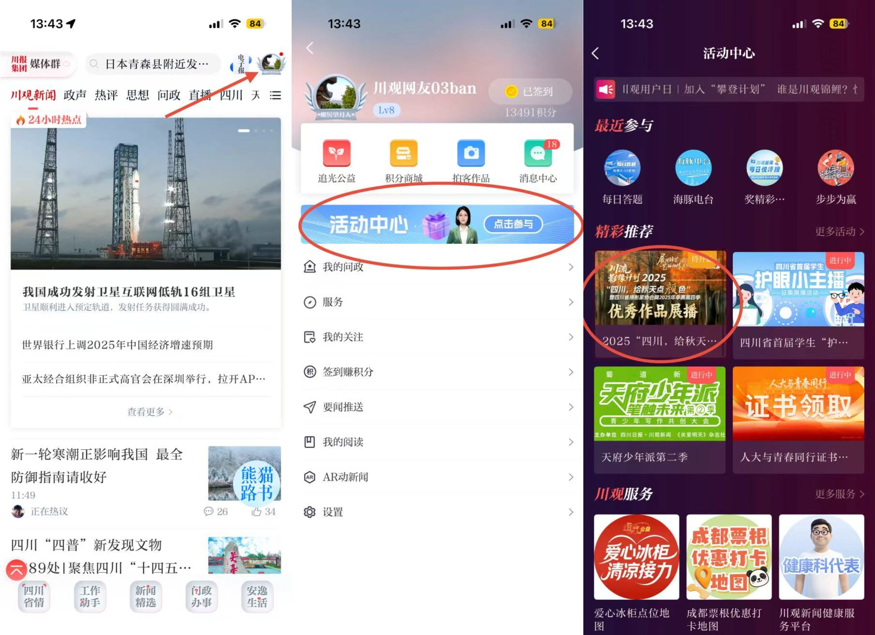 方式二:在川观新闻首页,点击右上角“我的”,点击“活动中心”,找到“秋色展播”活动图片,点击即可参与;