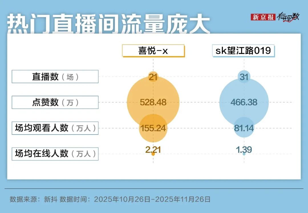 根据2025年抖音团播各大top排行,“喜悦-X”和“SK望江路019”持续霸榜前两名。前者近三十天共直播21场,场均点赞528万,场均在线人数2.21万,场均观看人数155.24万。后者近三十天直播31场,场均在线人数1.39万,场均观看人数81.14万。