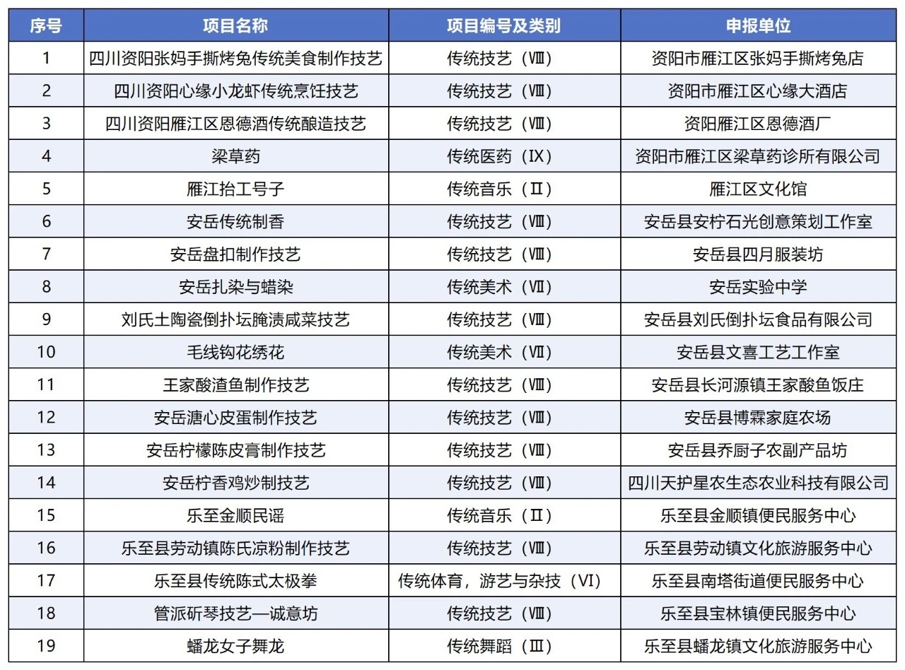 近日,资阳市第七批非物质文化遗产代表性项目名录出炉,包括四川资阳张妈手撕烤兔传统美食制作技艺、安岳盘扣制作技艺、蟠龙女子舞龙等19个项目入选。