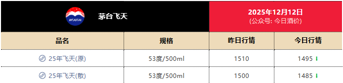 今日酒价披露各大名酒批发参考价显示,12月12日,25年飞天茅台(原箱)较前一日下跌15元,报1495元/瓶;25年飞天茅台(散瓶)较前一日下跌15元,报1485元/瓶。
