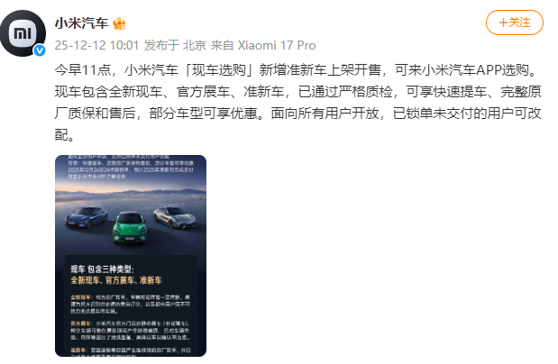 今早11点,小米汽车「现车选购」新增准新车上架开售,可来小米汽车APP选购。