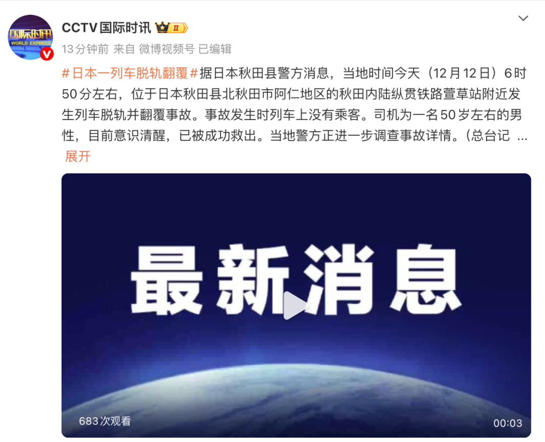 据央视新闻援引日本秋田县警方消息,当地时间今天(12月12日)6时50分左右,位于日本秋田县北秋田市阿仁地区的秋田内陆纵贯铁路萱草站附近发生列车脱轨并翻覆事故。