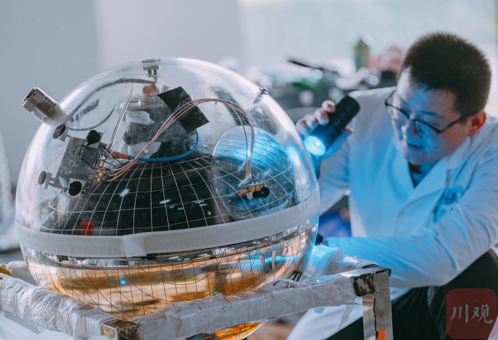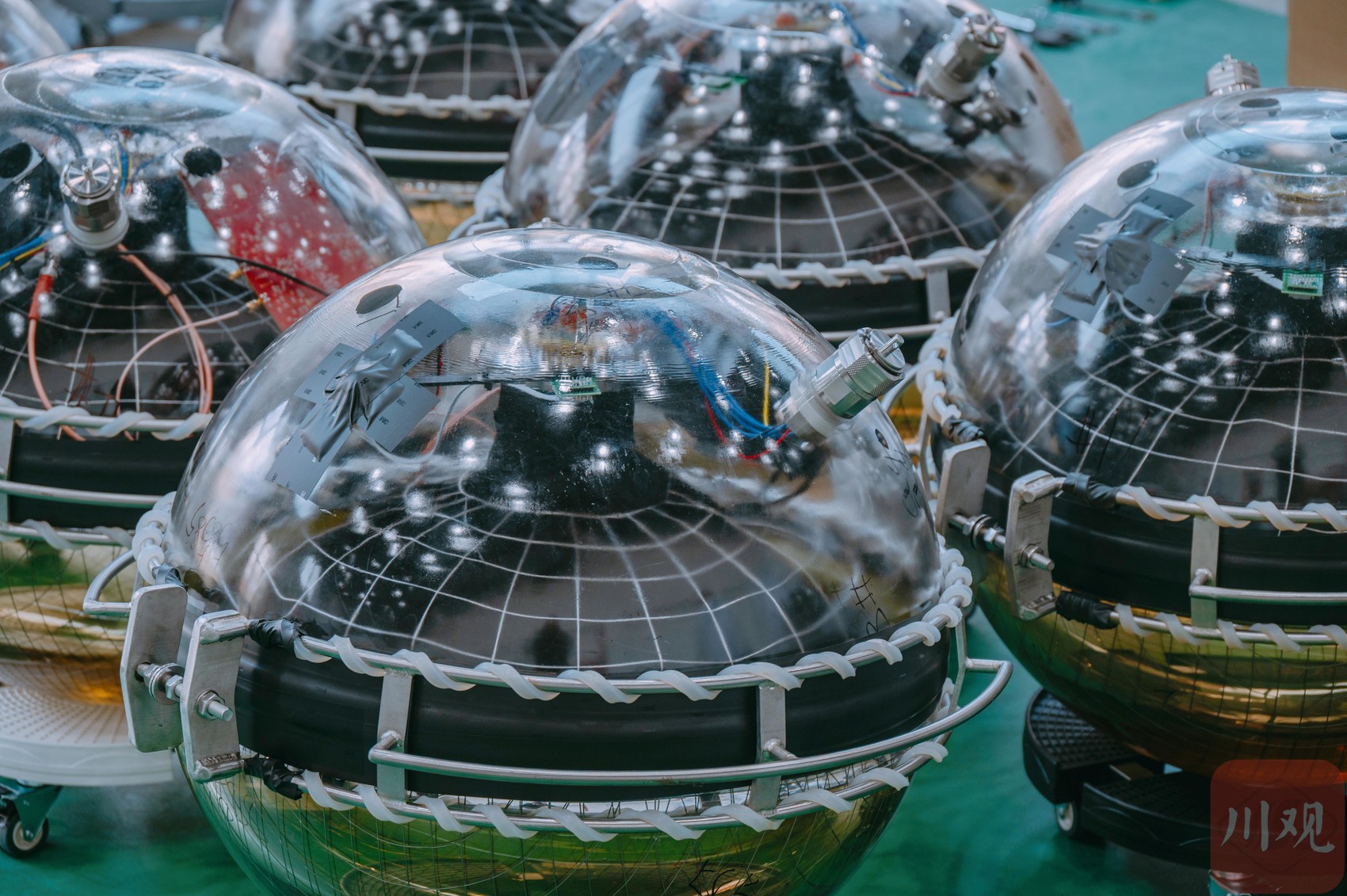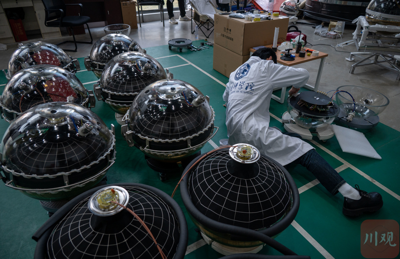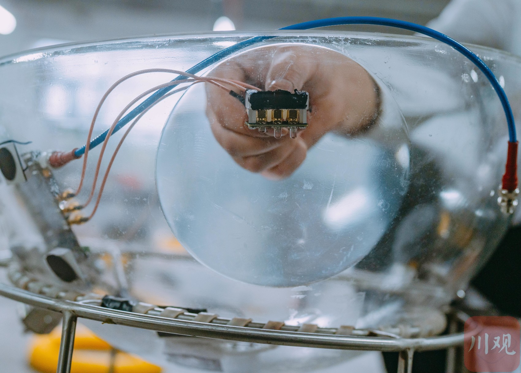 12月10日,四川天府宇宙线研究中心的实验室内,科研人员正在对装有超大光敏探头的23英寸玻璃球舱进行组装与测试。这批精密探测器即将被投放到千米深的水下,用于捕捉宇宙线在水中产生的极其微弱的切伦科夫蓝光。