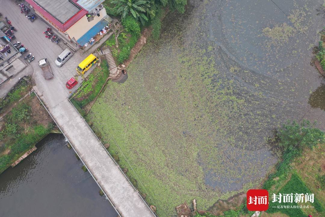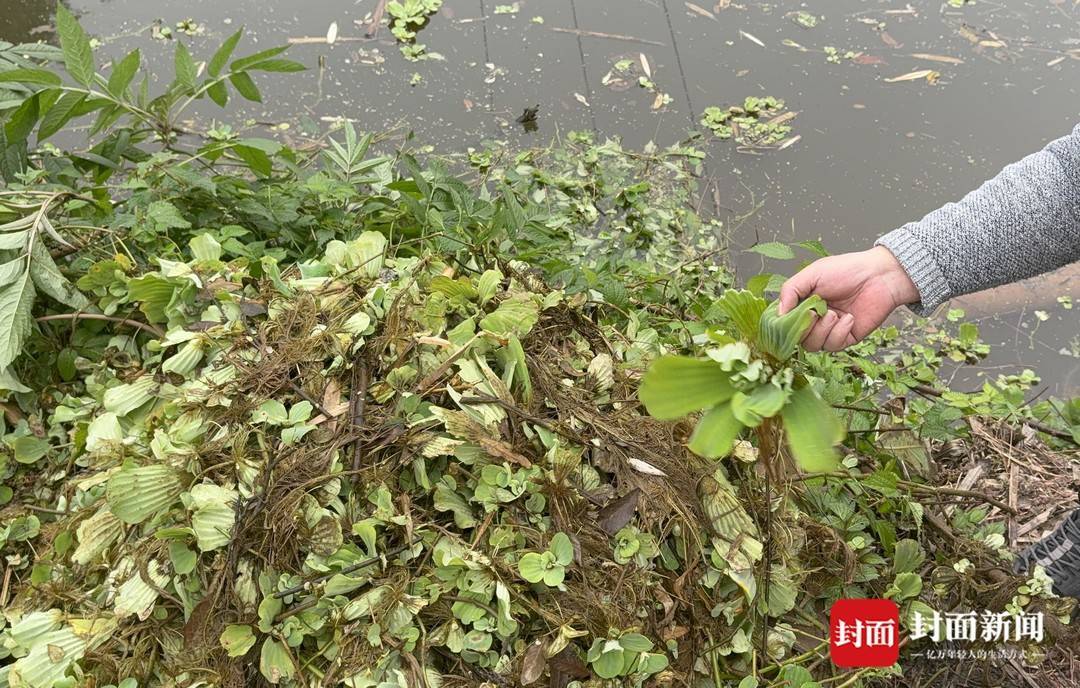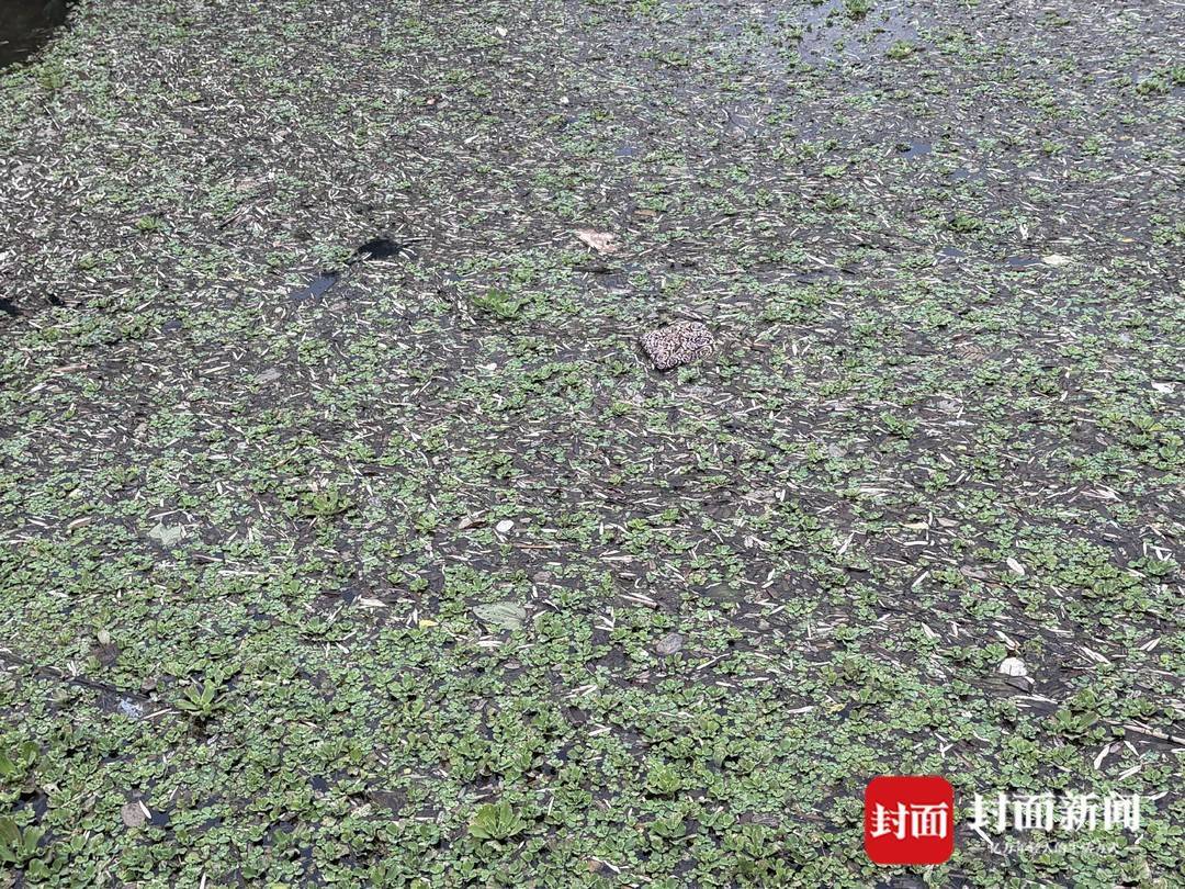 当天下午,记者走访发现漂浮物主要是外来入侵物种大薸,当地人称“水白菜”。其间夹杂着枯叶和生活垃圾,也有抱枕等生活用品,水色呈黄色。从空中俯瞰,能看到疑似油污的液体漂浮在水面上。