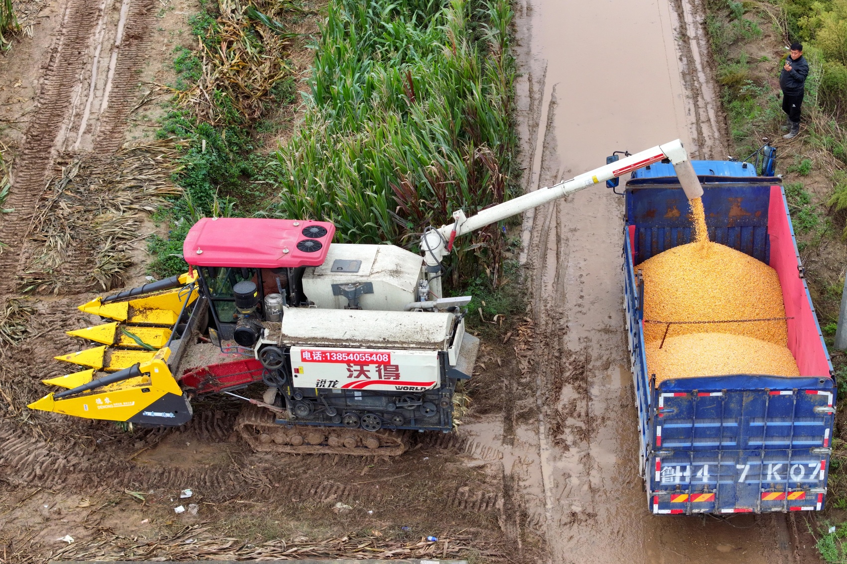 10月11日,在山东省菏泽市郓城县双桥镇,农机手将收获的玉米装车。新华社记者 郭绪雷 摄