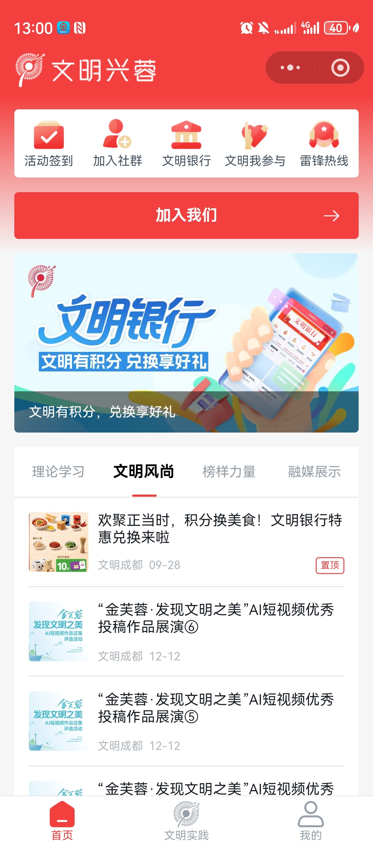 今年,成都市文明办对“文明兴蓉”智慧平台进行提档升级,创新建立市—区—镇(街道)—村(社区)四级联动的“文明银行”积分激励系统,通过拓展多元积分场景、丰富积分兑换场景、加强积分宣传推广,如策划“成都小雷锋·文明助世运”“文明成都·知礼而行”等丰富多彩的积分活动等,激发全民共建共治共享动能。