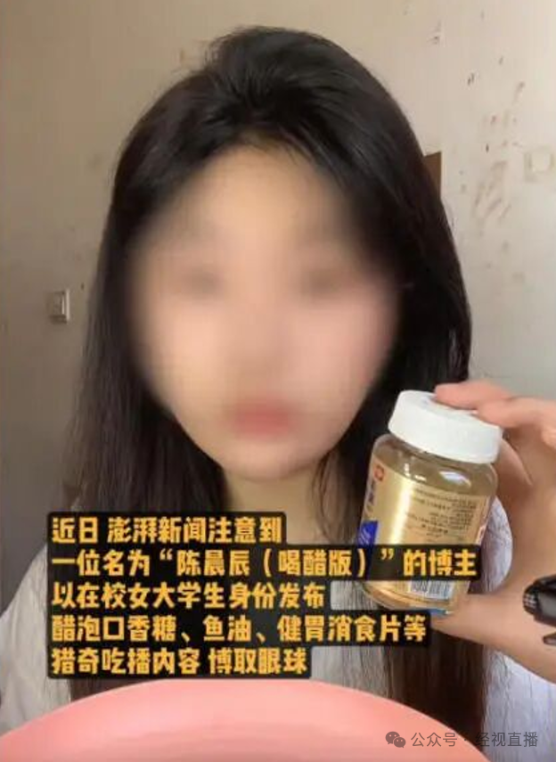 12月11日上午,澎湃新闻刊发女主播“陈晨辰(喝醋版)”用醋泡口香糖、鱼油等“畸形吃播”博取眼球的报道,同天下午,快手、抖音平台封禁、禁止关注其账户。