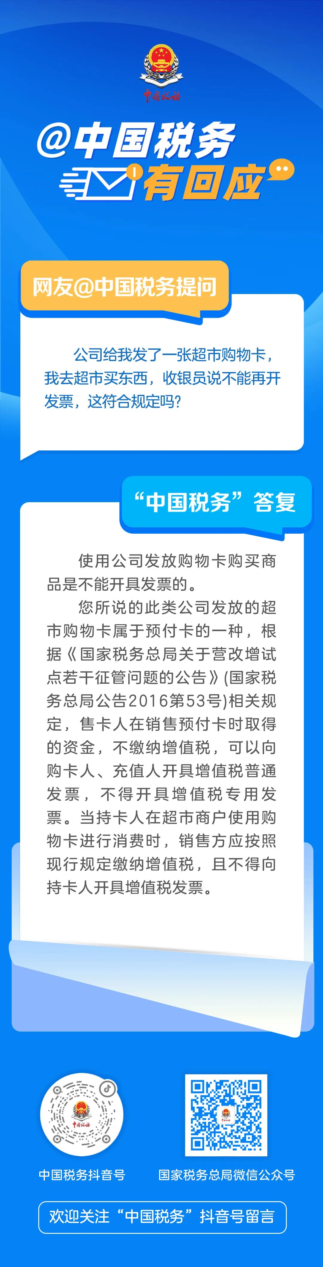 有网友问:“公司给我发了一张超市购物卡,我去超市买东西,收银员说不能再开发票,这符合规定吗?”一起来看看回复吧↓