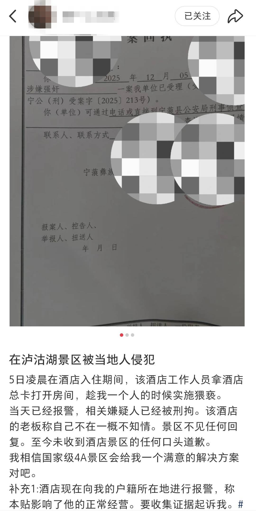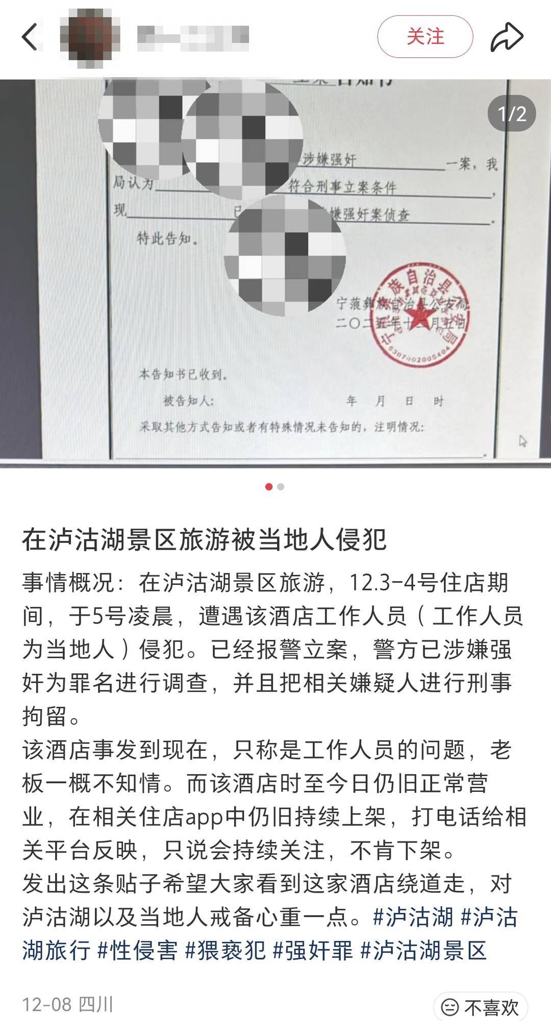 12月8日,一名女性游客发帖称,在云南丽江泸沽湖景区旅游时,遭酒店工作人员侵犯,已报警立案,警方已以涉嫌强奸对相关嫌疑人进行刑事拘留。该游客称,该酒店工作人员拿酒店总卡打开房门,事发后未收到酒店和景区的任何口头道歉,酒店向游客户籍所在地报警,称帖子影响酒店正常经营。
