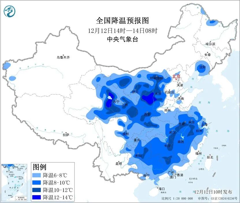 受寒潮影响,12月12日14时至14日08时,我国中东部地区将自西向东出现大风降温,日平均或最低气温普遍下降6~8℃,青海东部、甘肃东部、内蒙古西部、陕西北部、山西西部、江南北部以及广东北部等地部分地区下降10~12℃,局地降温可达12~14℃。12月14日早晨,最低温度0℃线将南压至浙江南部、江西北部、湖北南部一带。
