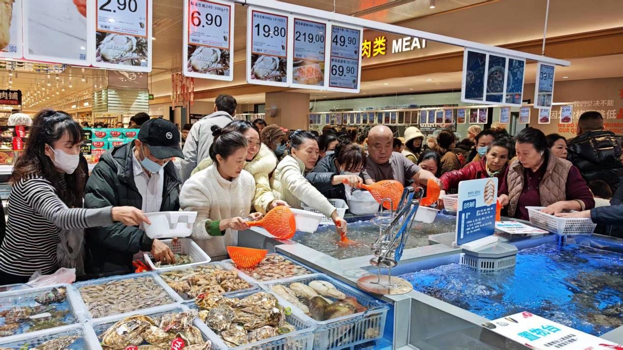 生鲜商品在保障民生基本需求的基础上,大幅增加了中高端与特色品质商品的供给,以回应消费者日益多样化、精致化的生活追求。肉禽区主推新鲜牛羊肉,其中厚切多汁的战斧牛排尤为值得推荐,适合家庭分享或节日盛宴,为餐桌增添满足感。水产区重点推出帝王蟹、波龙、龙胆石斑鱼及蓝鳍金枪鱼等全球优质海产。门店更定期举办“金枪鱼现场开鱼秀”,由专业师傅现场分割并解说不同部位,让顾客在选购的同时,感受鲜活与仪式感。