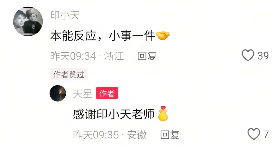12月10日,印小天个人社交平台账号在宋先生的这条视频下回复表示,“本能反应,小事一件。”宋先生回复,“感谢印小天老师!”