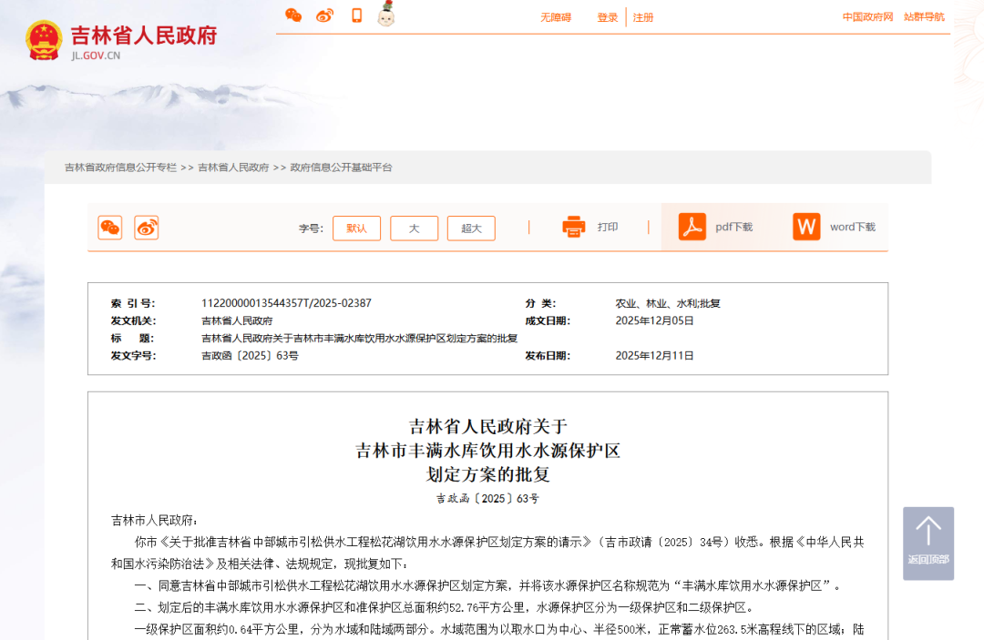 你市《关于批准吉林省中部城市引松供水工程松花湖饮用水水源保护区划定方案的请示》(吉市政请〔2025〕34号)收悉。根据《中华人民共和国水污染防治法》及相关法律、法规规定,现批复如下: