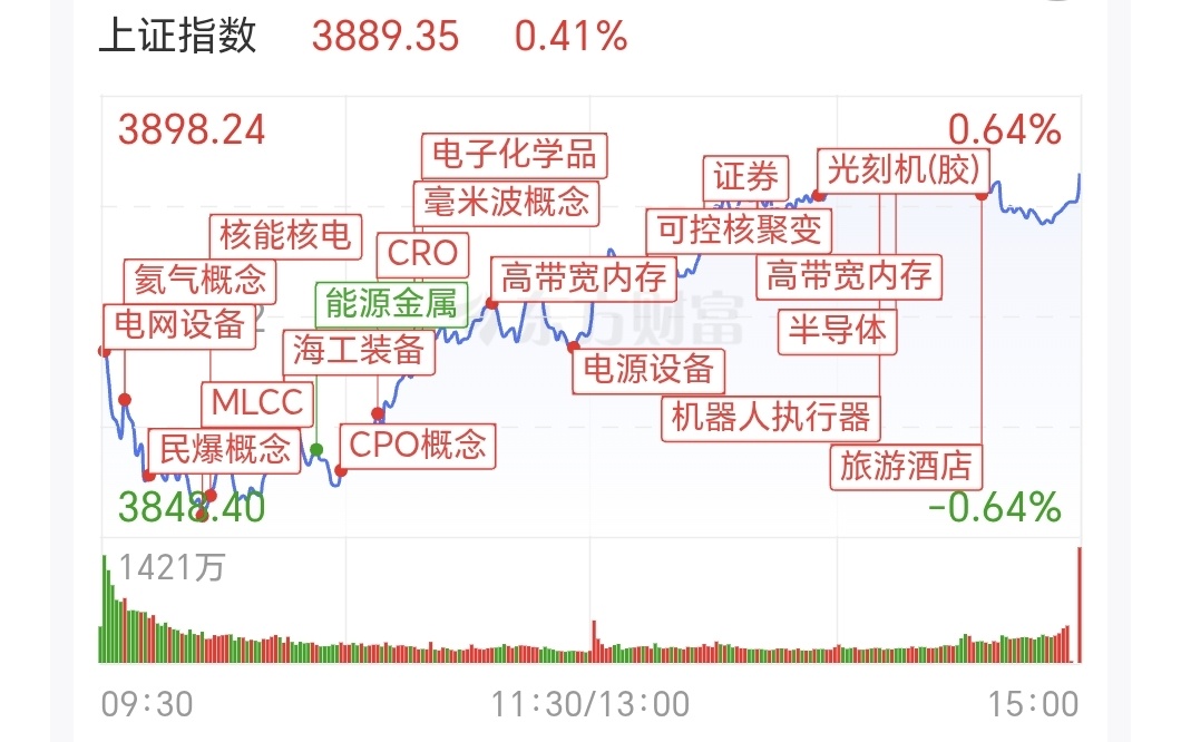 12月12日,A股在探底回升中实现全线收红,三大指数同步走高,市场活跃度显著提升。截至收盘,沪指上涨0.41%报3889.35点,深证成指涨0.84%收13258.33点,创业板指涨0.97%至3194.36点。