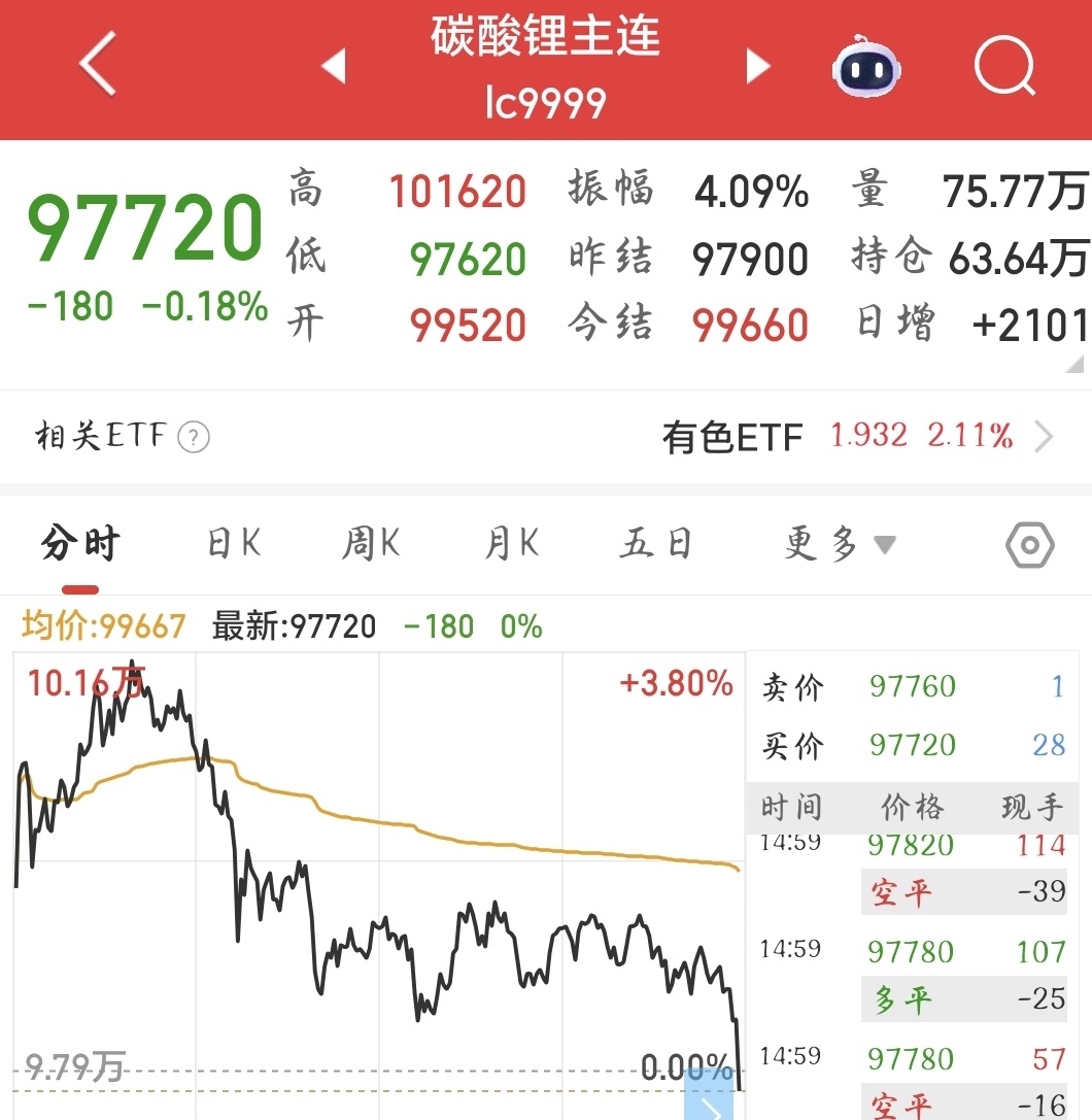 不过,碳酸锂期货当日冲高回落,主连合约最终收于97720元/吨,较前日结算价97900元/吨微跌180元。