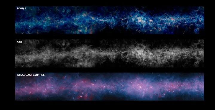 银纬±1度范围内“银河画卷”巡天与其他巡天的比较图。上图是“银河画卷”三种一氧化碳同位素谱线,表征不同密度的分子气体环境;中图是美国五大学望远镜实施的银河系环巡天积分强度图;下图展示了智利阿塔卡马望远镜的银河系大区域巡天(870微米,红色)和美国斯必泽银河系中平面红外巡天(24微米,蓝色)的合成图,主要展示银盘上尘埃的热辐射。(中国科学院紫金山天文台供图)