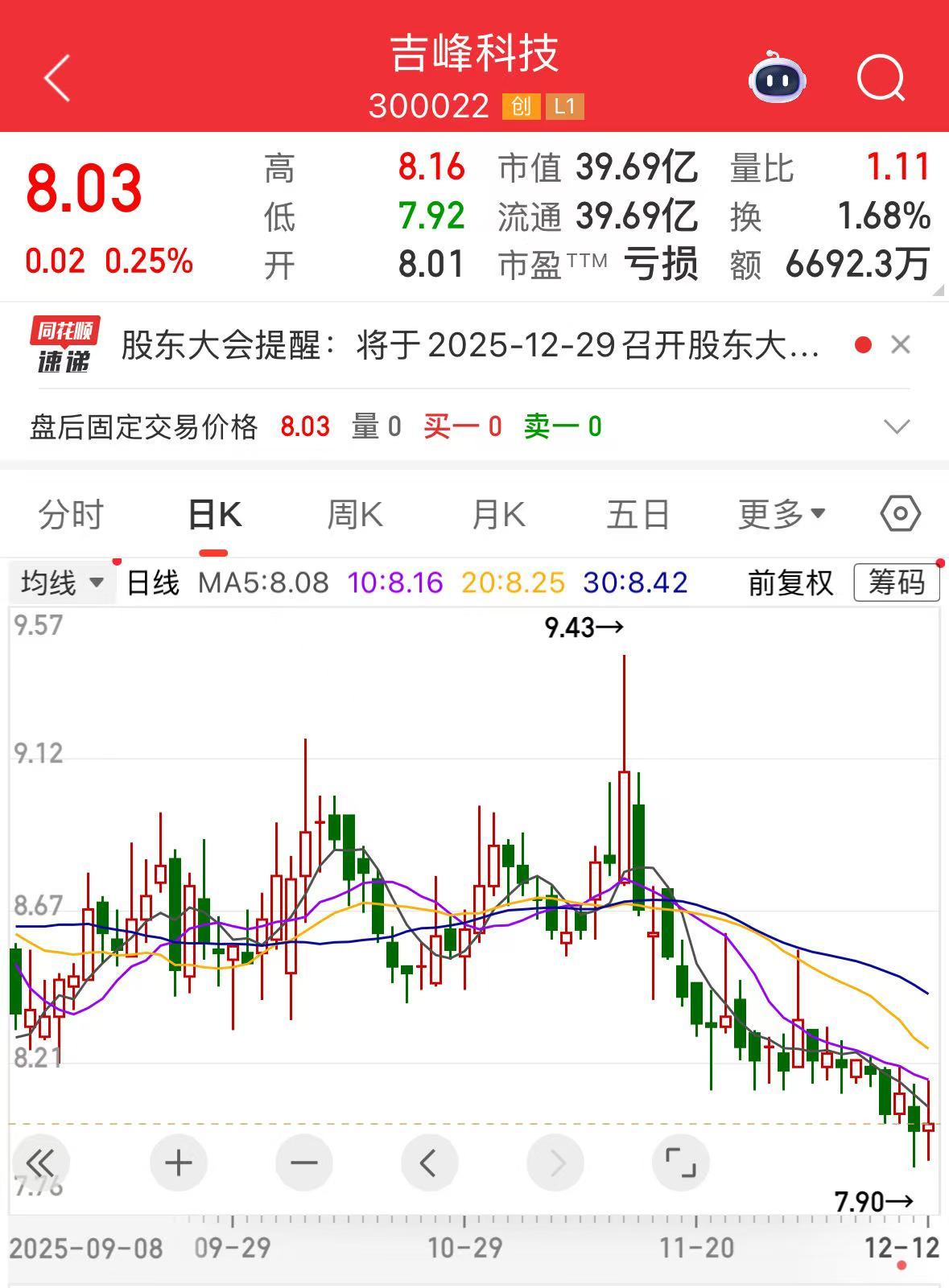 二级市场方面,截至12月12日收盘,吉峰科技报8.03元/股,总市值39.69亿元。