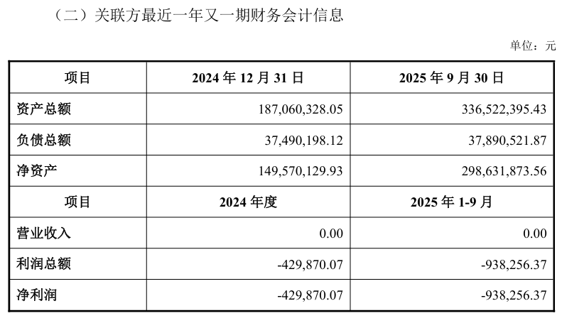 财务数据显示,该公司尚未产生营业收入。2024年度净利润为-42.99万元。2025年1-9月净利润为-93.83万元,处于持续亏损状态。截至2025年9月30日,资产总额约3.37亿元、负债总额约3789.05万元、净资产约2.99亿元。