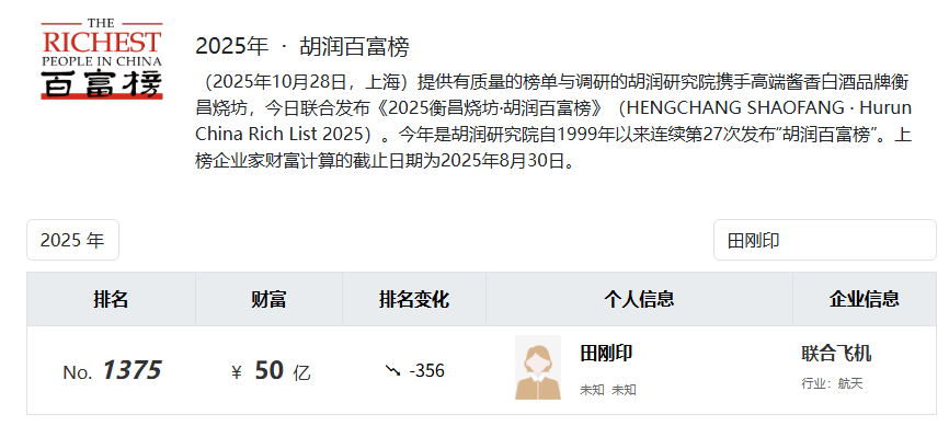 据悉,田刚印出生于1981年5月,北京理工大学自动控制专业博士,曾以50亿元身家登上2025年胡润百富榜。