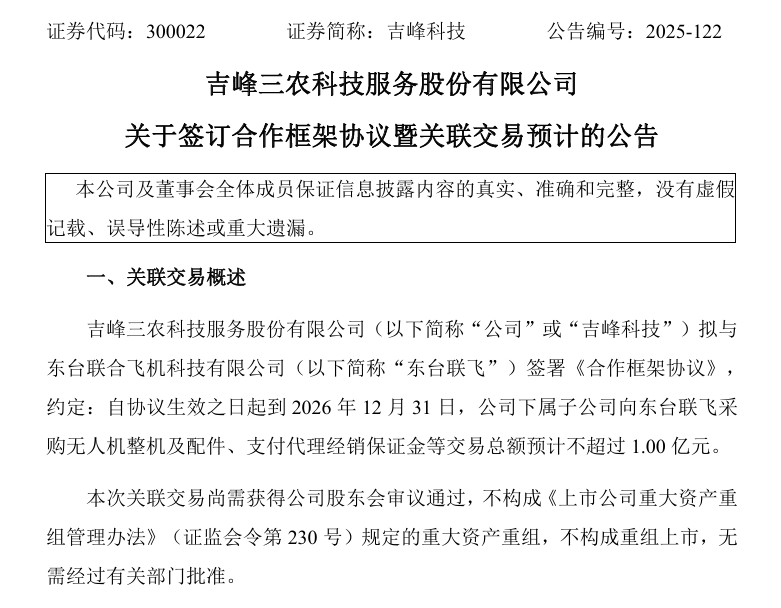 12月10日,吉峰科技公告显示,拟与东台联合飞机科技有限公司(下称“东台联飞”)签署《合作框架协议》,计划自协议生效之日起至2026年12月31日,通过其子公司向东台联飞采购无人机整机及配件,并支付代理经销保证金等,预计交易总额不超过1.00亿元。