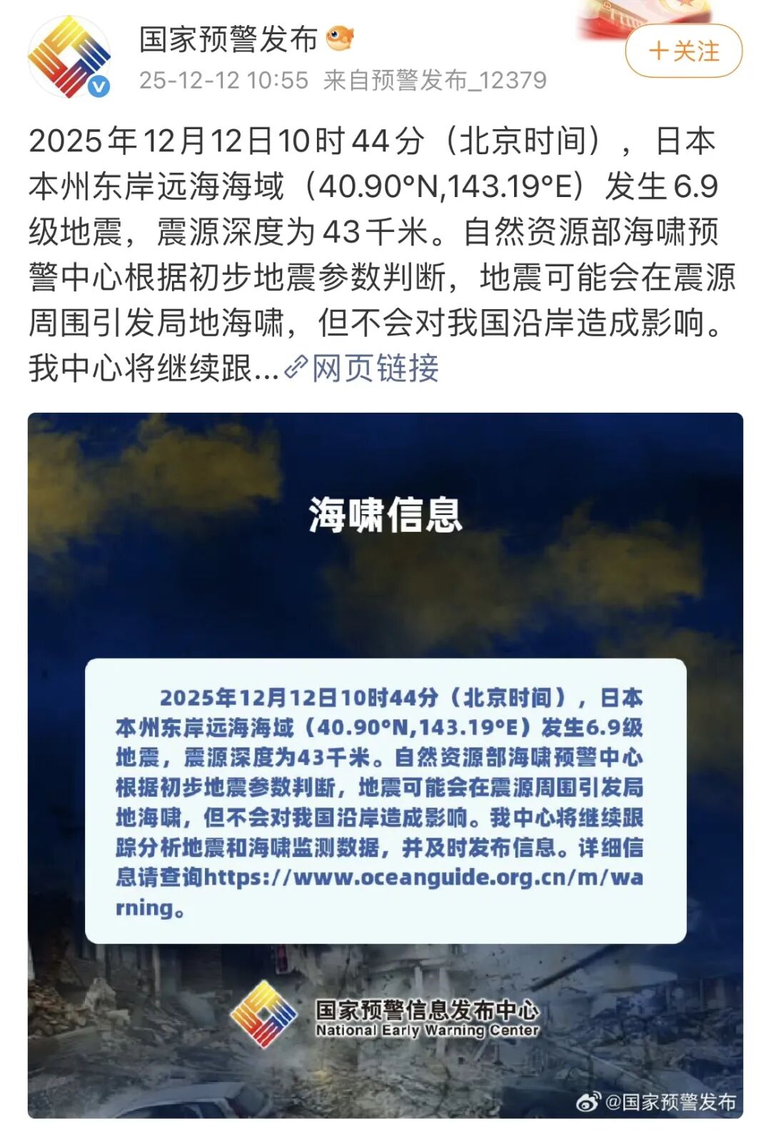 据国家预警发布官博消息,2025年12月12日10时44分(北京时间),日本本州东岸远海海域(40.90°N,143.19°E)发生6.9级地震,震源深度为43千米。自然资源部海啸预警中心根据初步地震参数判断,地震可能会在震源周围引发局地海啸,但不会对我国沿岸造成影响。