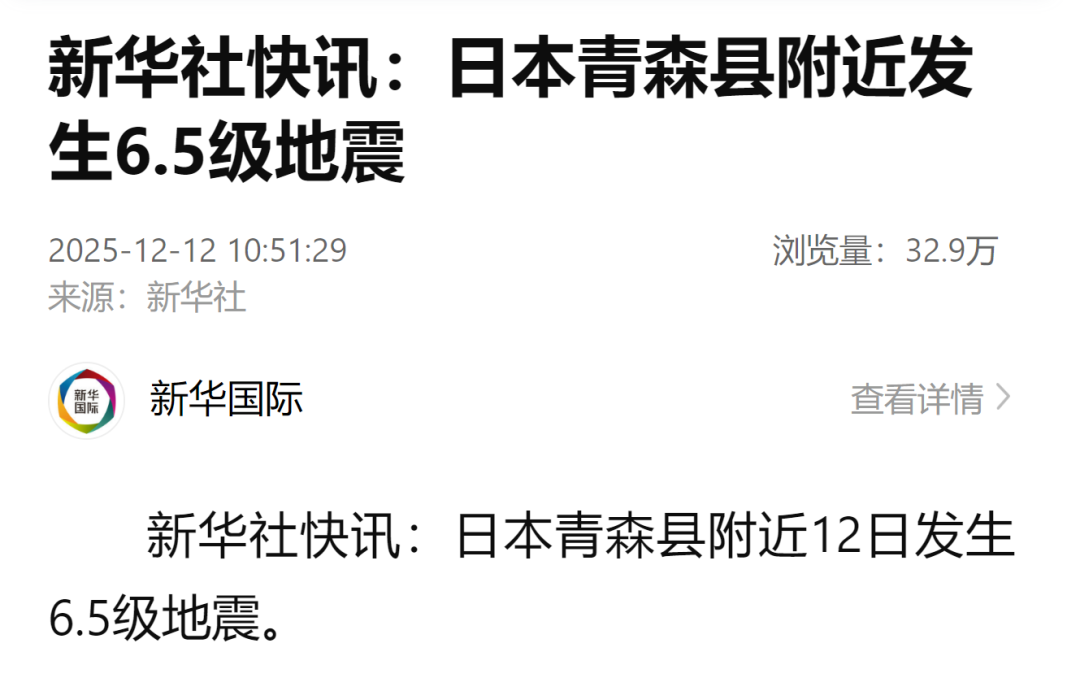另据新华社,日本青森县附近12日发生6.5级地震,此前日本政府发布紧急地震预警。