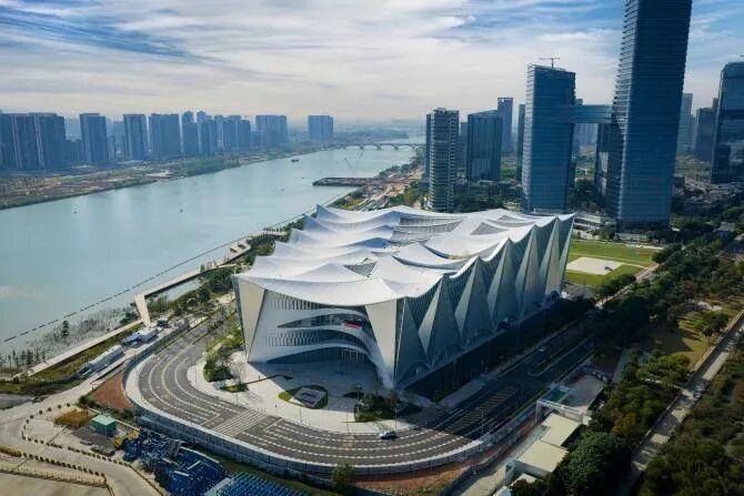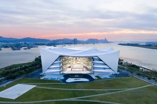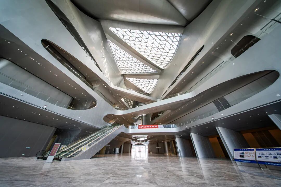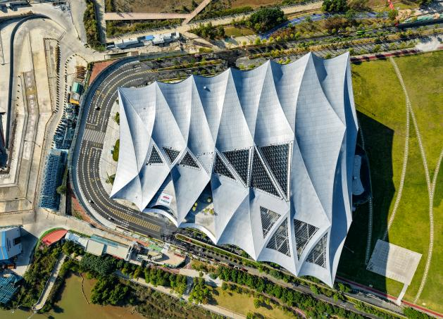 全国首创的连续波浪形单层刚性悬垂网壳结构、全国最大的波浪形连续焊接不锈钢屋面,搭配全程践行环保理念的“近零碳建筑”设计,这座新地标从里到外都浸润着前沿科技内核。
