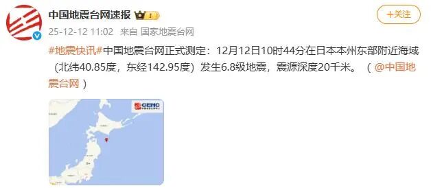 中国地震台网正式测定:12月12日10时44分在日本本州东部附近海域(北纬40.85度,东经142.95度)发生6.8级地震,震源深度20千米。