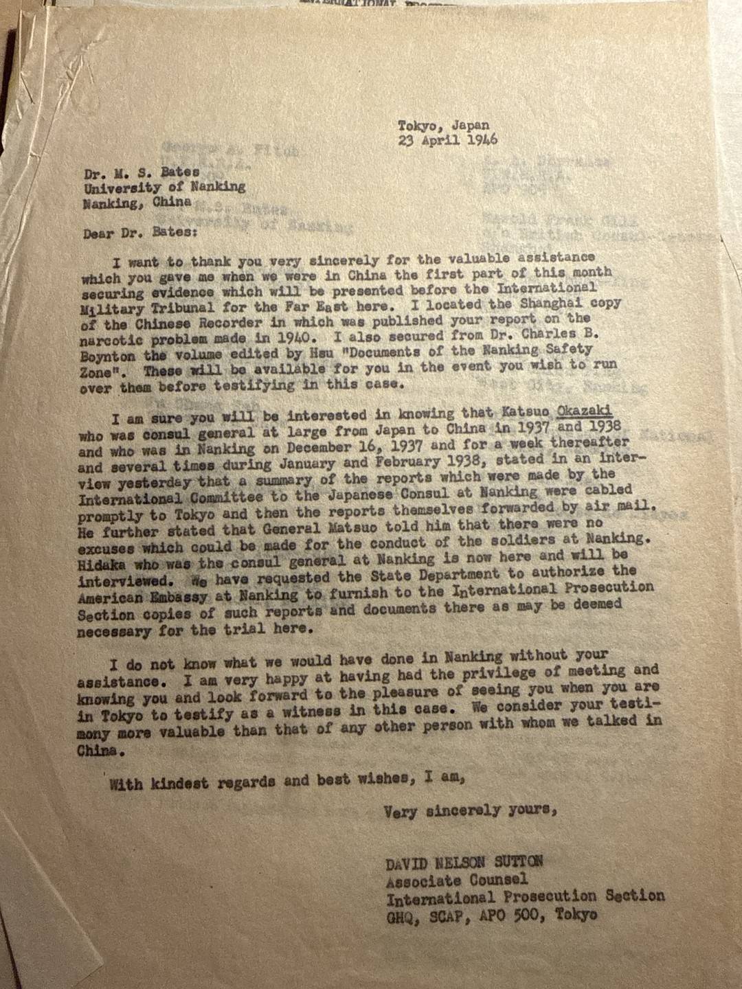 在一封写给南京大屠杀重要见证人、金陵大学副校长贝德士的信中,萨顿提到,他曾与日本前驻南京总领事冈崎胜男会面。冈崎亲口证实,日军指挥官松井石根对南京暴行“完全知晓”,并认为“毫无借口”。