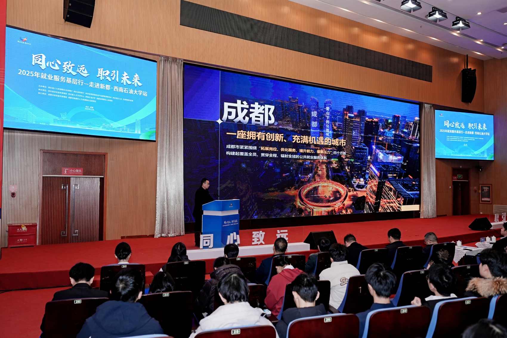 12月11日,在西南石油大学校园内,以“同心致远 职引未来”为主题的“2025年就业服务基层行——走进新都·西南石油大学站”活动举行。本次活动由四川省人力资源和社会保障厅、四川省教育厅、四川省国资委、四川省总工会、共青团四川省委共同主办,四川省就业服务管理局、四川省人才交流中心、西南石油大学、成都市新都区政府联合承办。活动通过“高校人才双选会+职业指导+直播带岗+就业社保政策宣传”等多元形式,为高校毕业生搭建起一座从校园到社会的“暖心桥”。