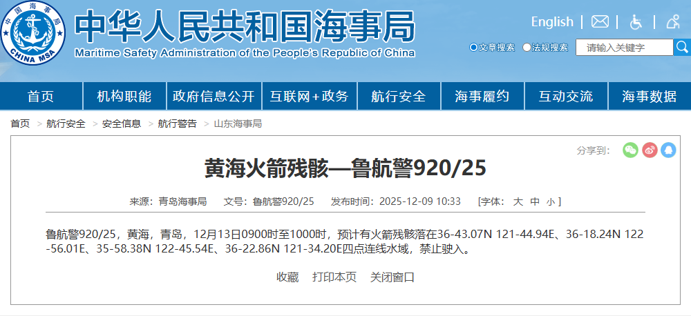 鲁航警920/25,黄海,青岛,12月13日0900时至1000时,预计有火箭残骸落在36-43.07N 121-44.94E、36-18.24N 122-56.01E、35-58.38N 122-45.54E、36-22.86N 121-34.20E四点连线水域,禁止驶入。