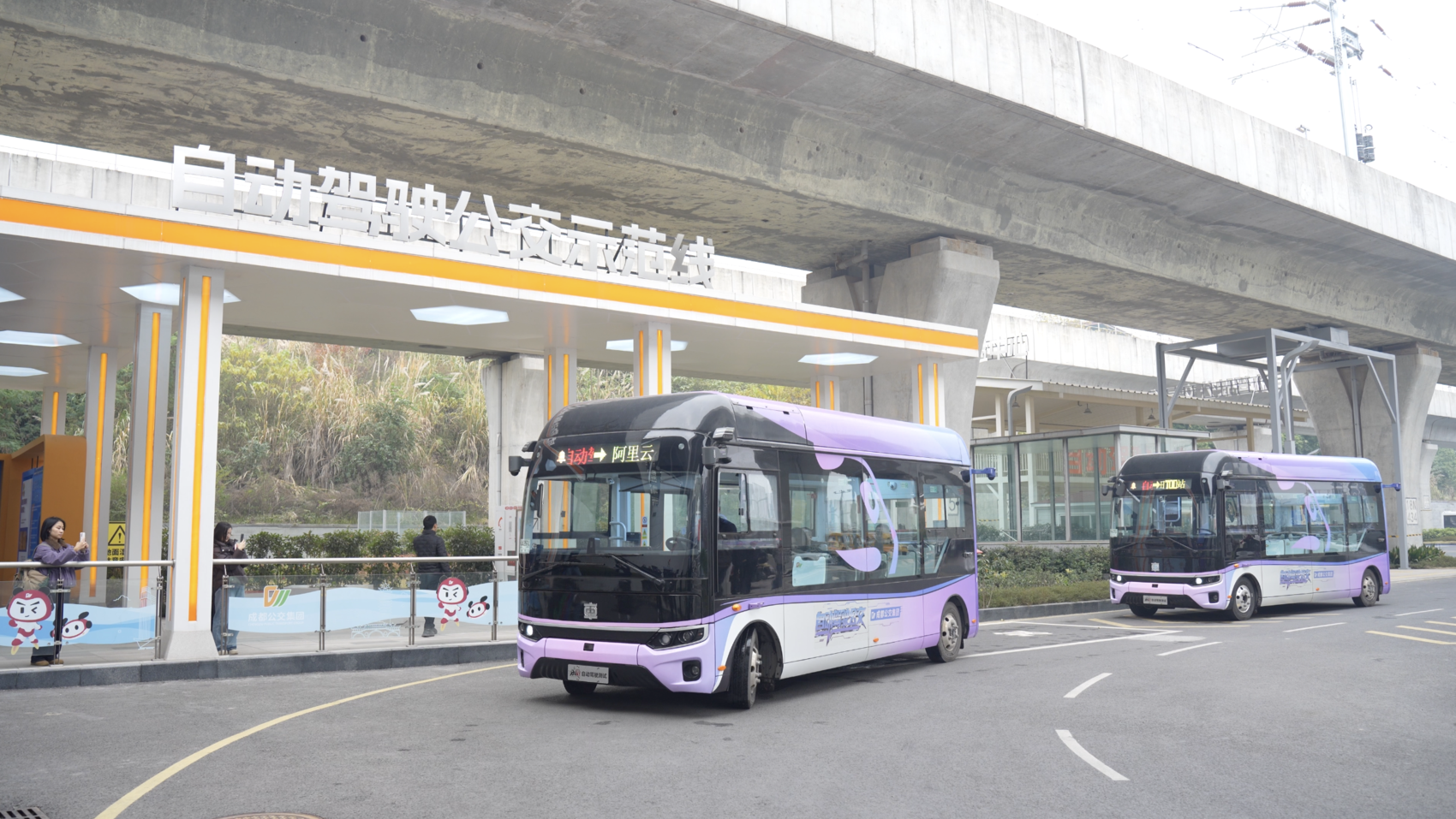 12月12日上午8时30分左右,成都未来科技城,两辆自动驾驶公交车载着乘客陆续从福田TOD公交站驶出。