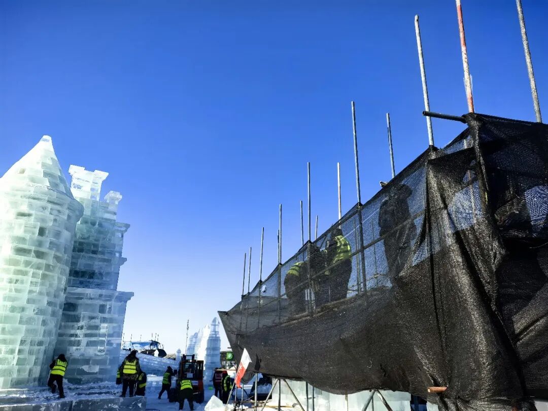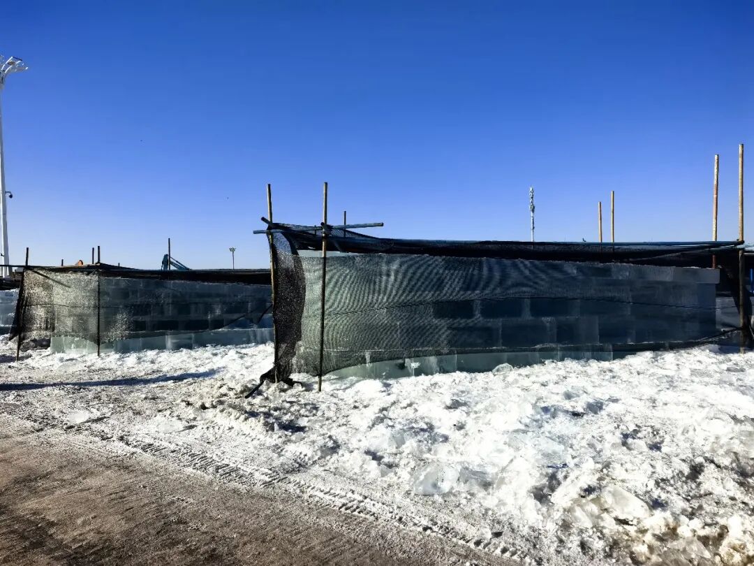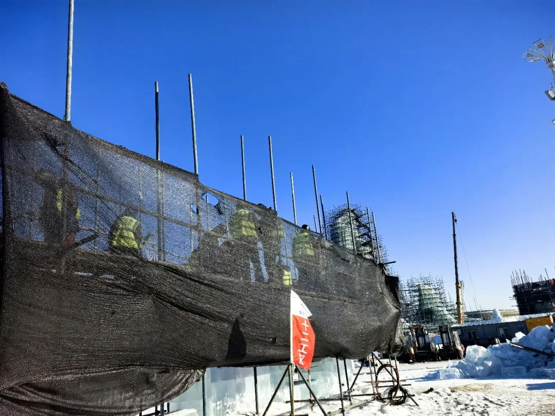冰雪大世界园区正在紧锣密鼓建设中,记者从黑龙江省建筑安装集团了解到,在冰建过程中,避免冰建被阳光直射也是保护冰建的重要措施。第二十七届冰雪大世界冰雪建设施工项目副总指挥、龙江安装工程管理部总经理李世滨介绍,在距离冰建1米左右,会搭建脚手架,周围用黑色的遮阳网挡住中午直射的阳光。因为即使在零下20℃的低温下,中午阳光直射也会影响冰的质量,搭建的黑色的“防晒服”可以有效减少阳光对冰体的热辐射,避免冰块受热影响通透性。