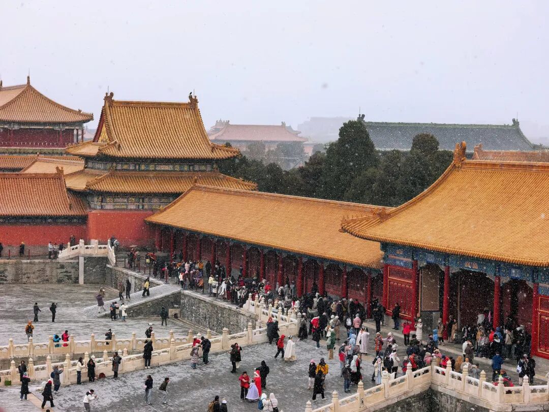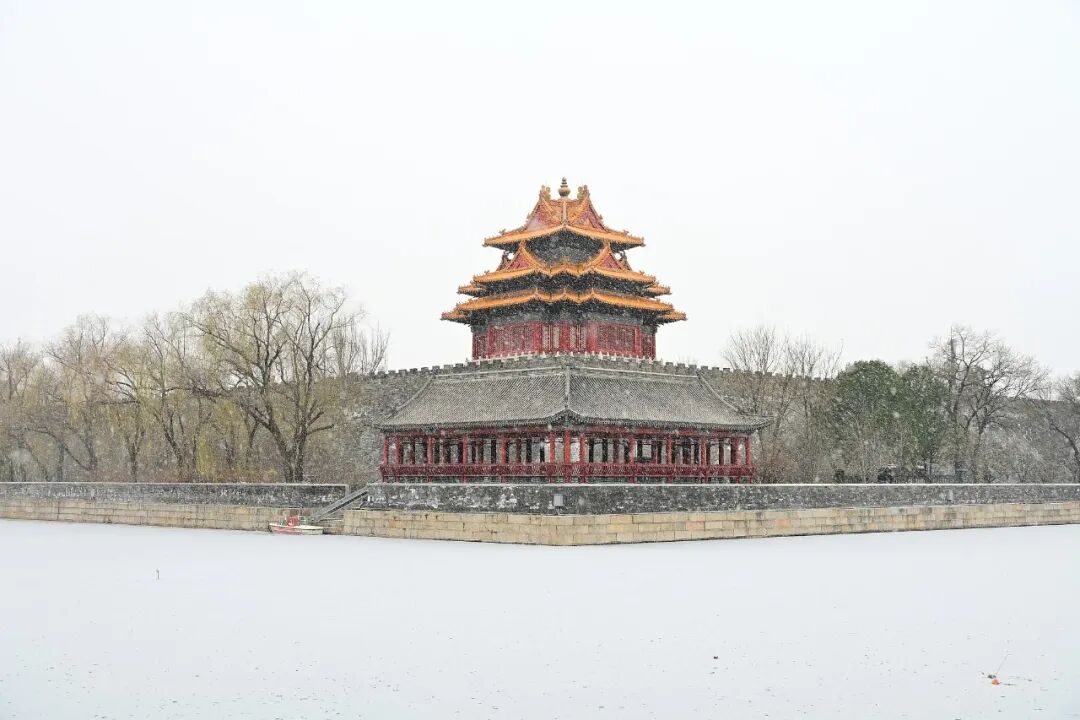 雪花落到紫禁城,自带背景音,淋漓尽致地展现中式浪漫。朱红色的宫墙、金色琉璃瓦……纷纷洒洒的白雪给饱和度高的紫禁城加了一层天然滤镜,为严肃的大殿添了一抹温度。