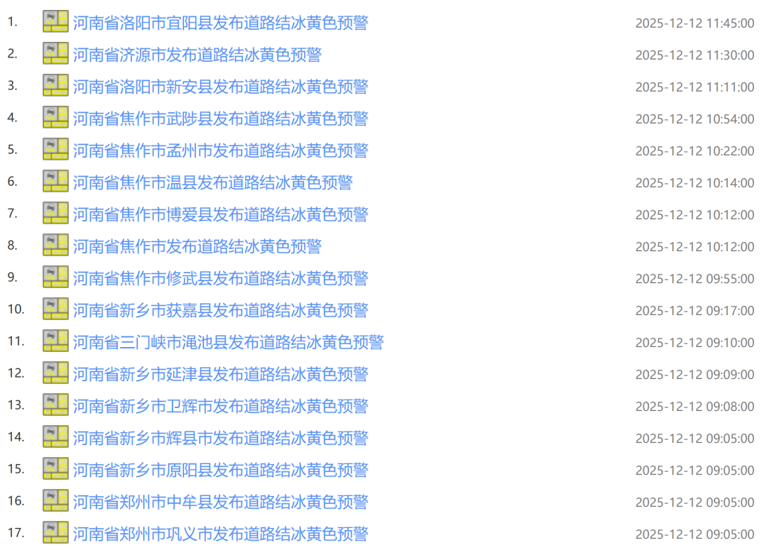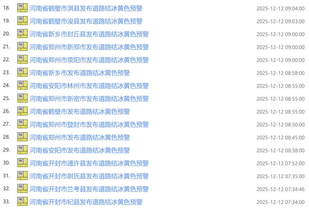 出行务必小心。截至12月12日中午12时,河南多地接连发布道路结冰黄色预警。开车请减速慢行,保持车距,行人也请当心滑倒。