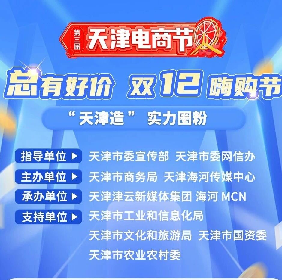 第三届天津电商节“双12”专场重磅来袭!12月12日13:30至21:30,由市委宣传部、市委网信办指导,市商务局、海河传媒中心主办,津云新媒体集团、海河MCN承办的天津电商节“双12”专场将在“津云”抖音账号开启直播。
