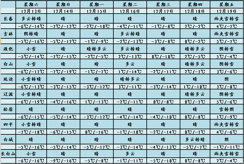 今天夜间到明天白天,最低气温:白山地区-20℃,其他地方-18~-14℃,最高气温:全省大部分地方-7~-5℃;长春市最低气温:-15℃,最高气温:-6℃。