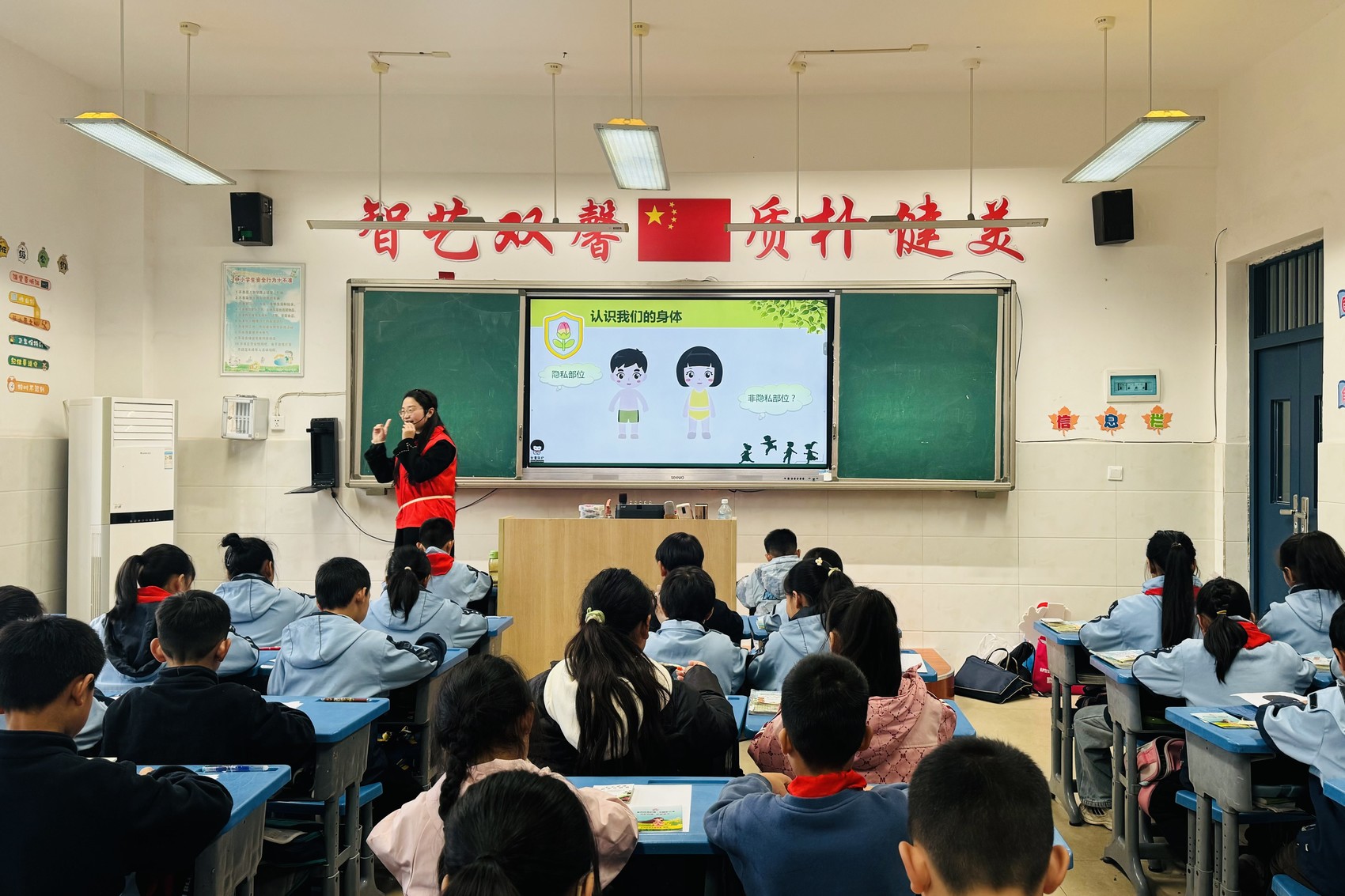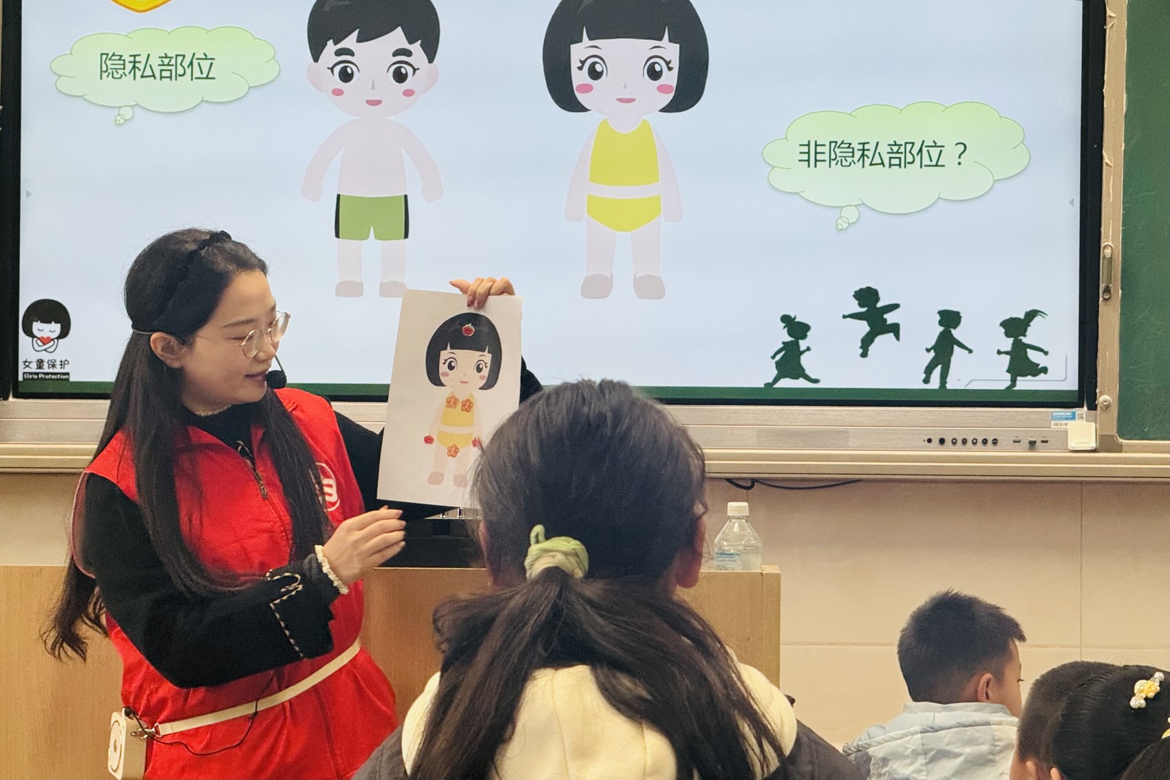 在巾帼志愿者何苏月的带领下,同学们以互动小游戏的方式,融入此次“花蕾课堂”。“课程以‘我的身体我做主’为核心,设计了递进式教学模块,引导孩子从知道到感受再到行动,逐步提升自我保护能力。”何苏月解释道,在认知层面,通过“人体地图绘制”等活动,让孩子认识隐私部位,清晰了解不可随意触碰的身体禁区。