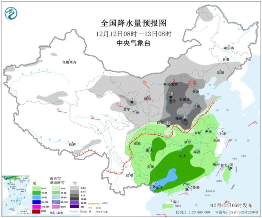 这次的雪也很“讲原则”,从12日08时到13日08时这24小时的全国降水预报图可以看到,雨雪的分界线,基本和南北分界线重合,“结界”很明显。相比北方的“暴雪”,南方的雨以小到中雨为主。